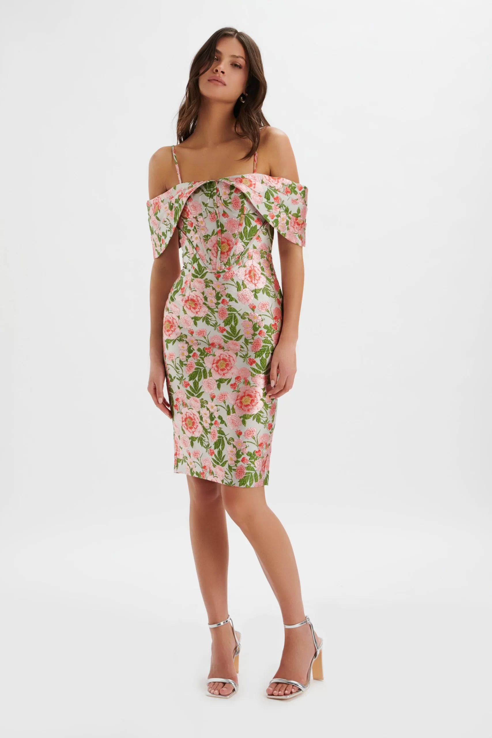 Expertly crafted with a flattering bardot style and corseted waist, the ANNALISE Midi Dress creates an elegant hourglass silhouette. Made with premium floral jacquard, this dress is perfect for spring events, adding a feminine and stylish touch with a pop of pink.