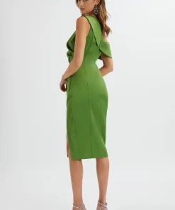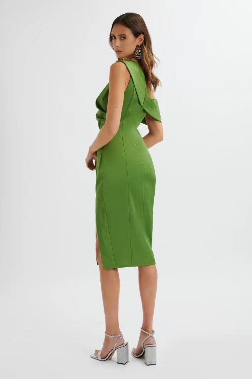 Introducing AUTUMN in regal Green. Crafted with structured bonded satin, this dress offers a close-to-body fit and features bust darts and princess seams for extra shaping. The classic midi length and alluring thigh split are complemented by the flattering pleating down the body, making this dress a must-have for any occasion.