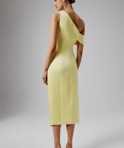 Make a bold statement this spring with our best-selling BAMBI dress, reimagined in a stunning seasonal yellow. Crafted from structured bonded satin, this exquisite dress hugs your figure with a close-to-body fit that beautifully accentuates your curves. The eye-catching asymmetric hemline, featuring a daring high split, adds an element of drama, while the statement pleating enhances its sophisticated allure. With its chic one-shoulder neckline, this dress effortlessly combines elegance and modern style, making it the ideal choice for wedding guest attire, ladies’ day events, and formal celebrations.