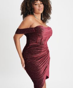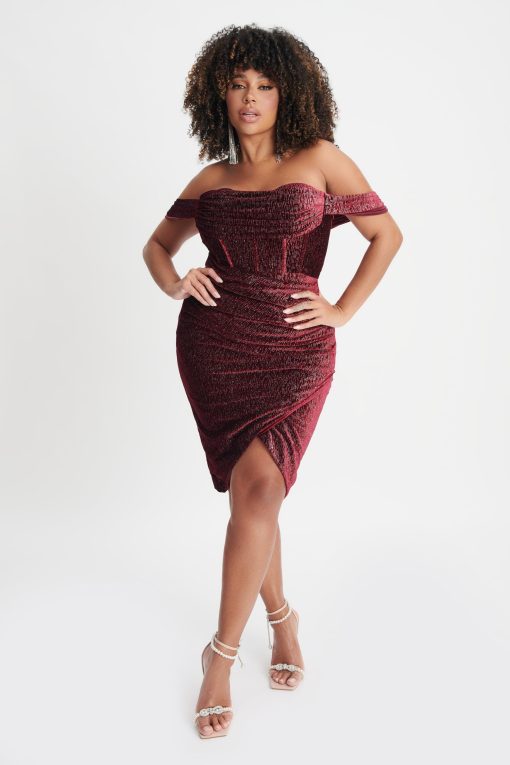 Warning, this dress may cause compliments! Featuring a sultry burgundy velvet body, enhanced by exclusive silver diamantes. Delicately draped, this off the shoulder neckline pairs perfectly with corset detailing to create a dreamy hourglass silhouette. Available in sizes 20 – 26.