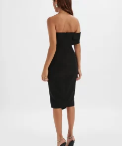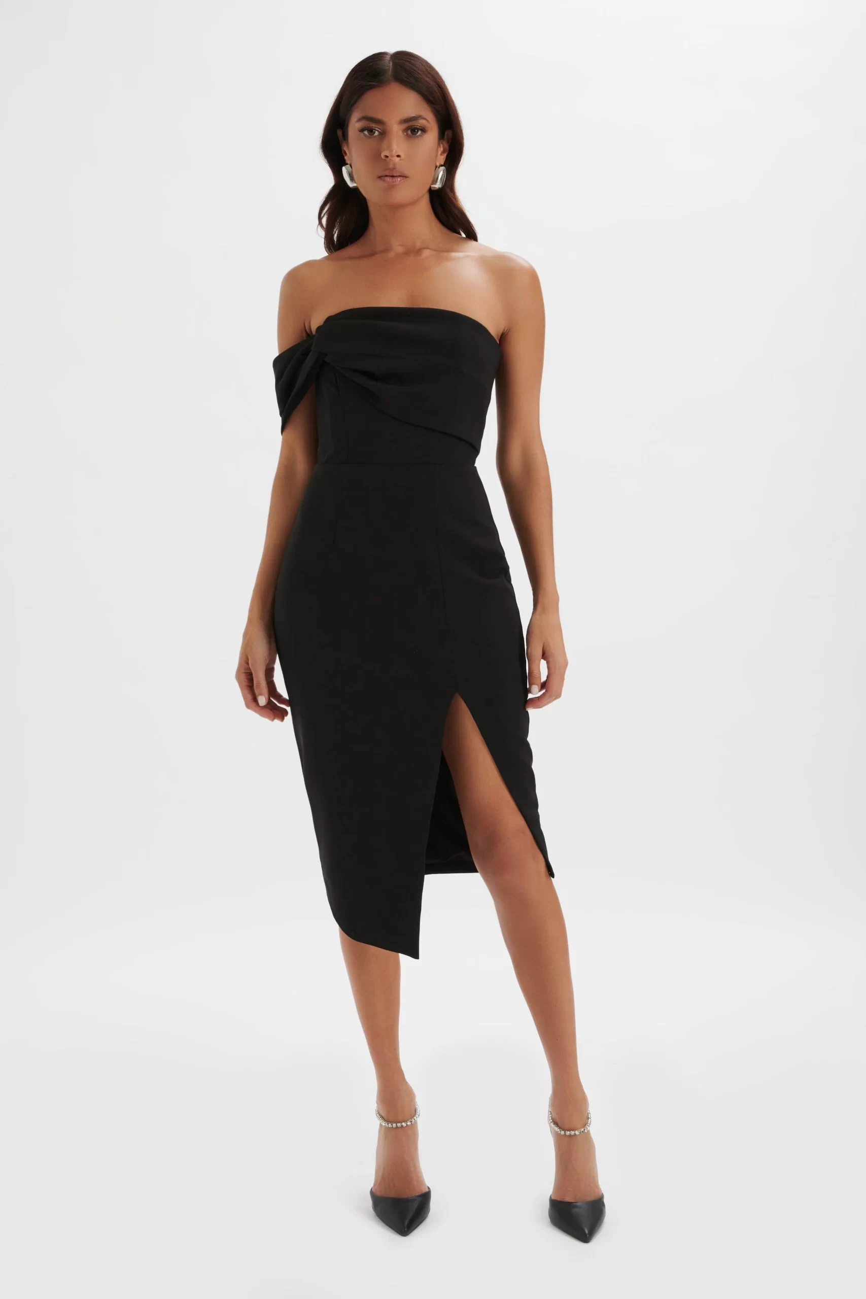 Expertly crafted from premium crepe fabric in black, this BRIE Bardot Knot Twisted One Shoulder Midi Dress is the epitome of chic and luxury. The knot twisted one shoulder design and elegantly tailored pleat detailing add a touch of sophistication, while the thigh split adds a flirtatious element. Perfect for formal occasions, this versatile dress offers a close to body fit for a confidently elegant look.