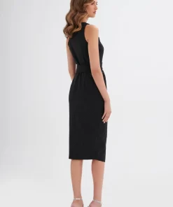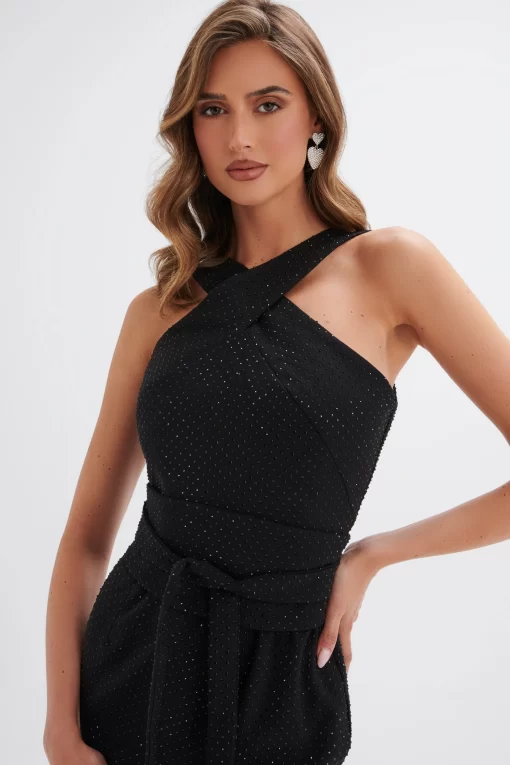 Introducing our crowd-favourite: the BRIELLE Obi Belted Halterneck Midi Dress, now offered in a timeless black hue adorned with dazzling black crystal embellishments .Meticulously crafted from premium crepe, this midi dress boasts a figure-hugging fit and an elegant obi belt, designed to enhance your silhouette effortlessly. The chic cross halter neck detail and subtle thigh split add a touch of allure, epitomizing elegance and sophistication. Embrace timeless charm with our stunning BRIELLE dress, ideal for any formal affair or black-tie event.