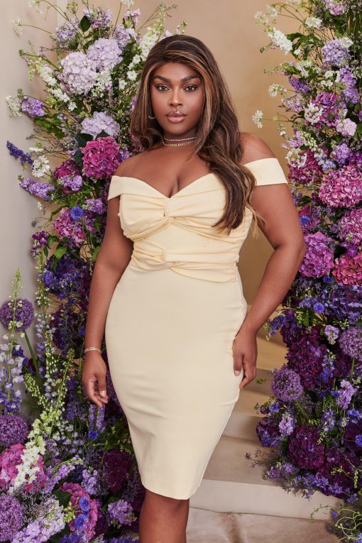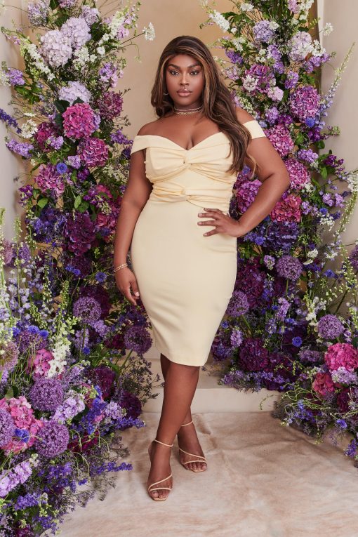 Make a classic statement this season with this butter off the shoulder CLAIRE midi dress. Its twist front is the epitome of elegance to elevate your style for your upcoming birthday or wedding. Available is sizes 20-26.