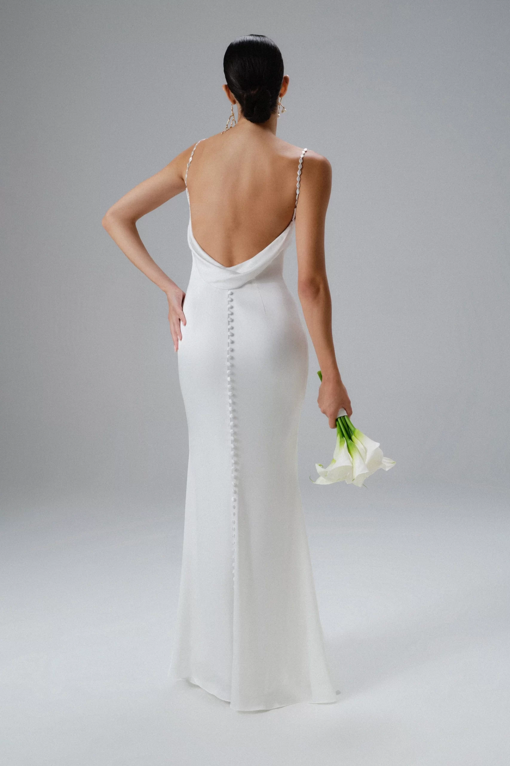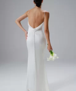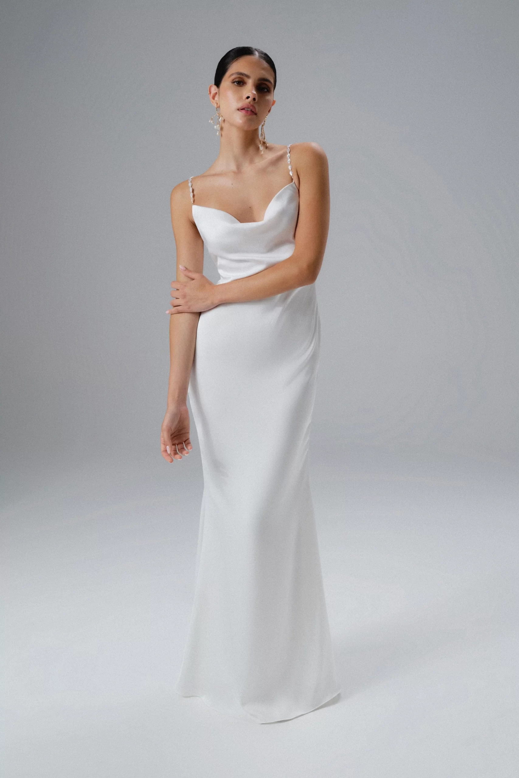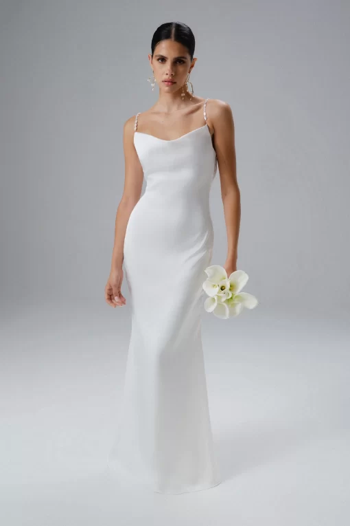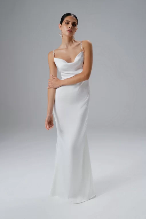 Meticulously crafted from premium draped satin in a stunning crisp white, the DANI Pearl Trim Cowl Neck Maxi Dress radiates elegance and luxury. Luxurious satin cascades gracefully to the floor, complemented by delicate pearl-trimmed straps and a gentle cowl neck, accentuating it’s flattering close-to-body fit. This piece epitomizes delicate romance, making it the perfect choice for those seeking sophistication and charm at any upcoming bridal event.