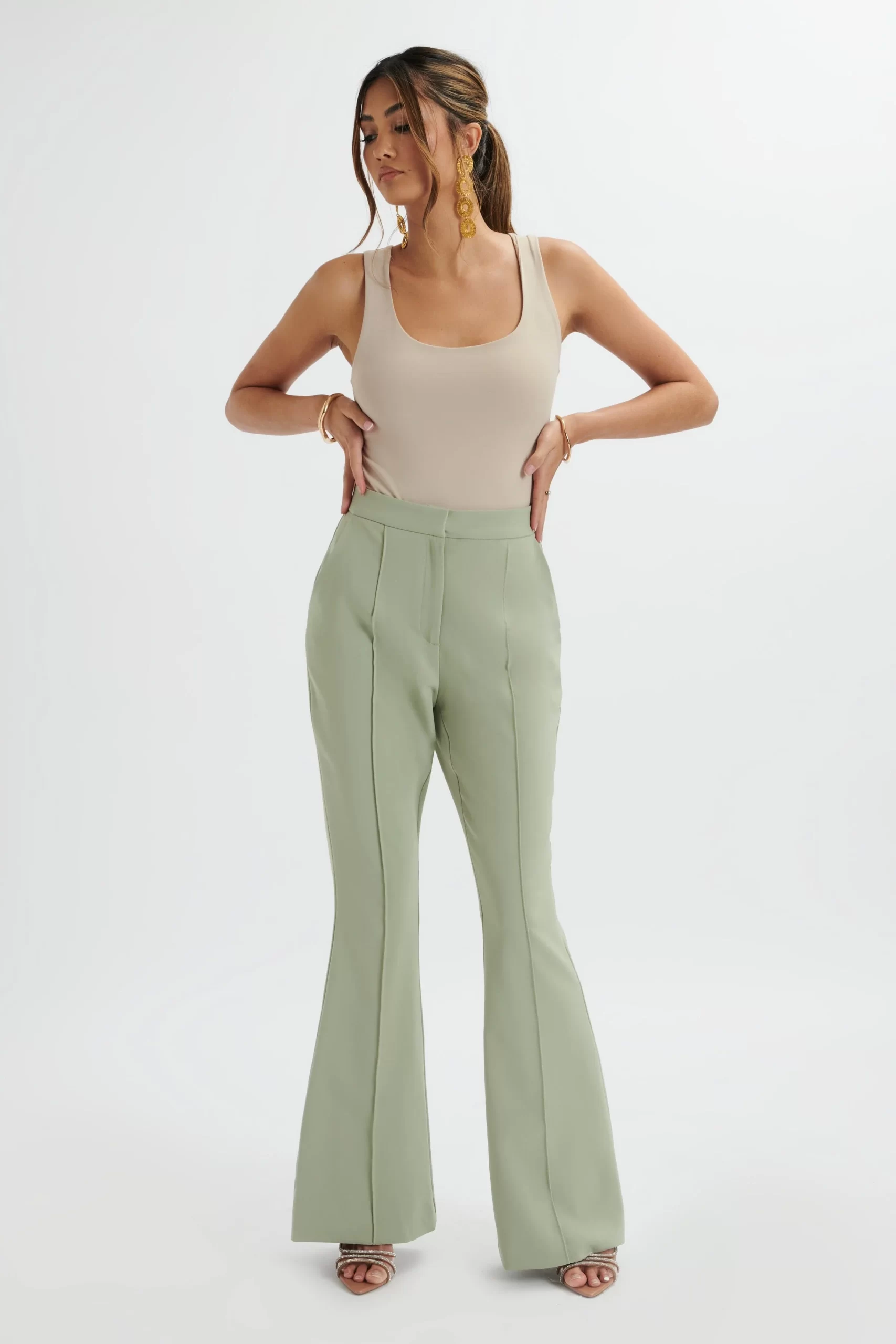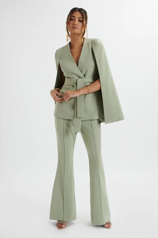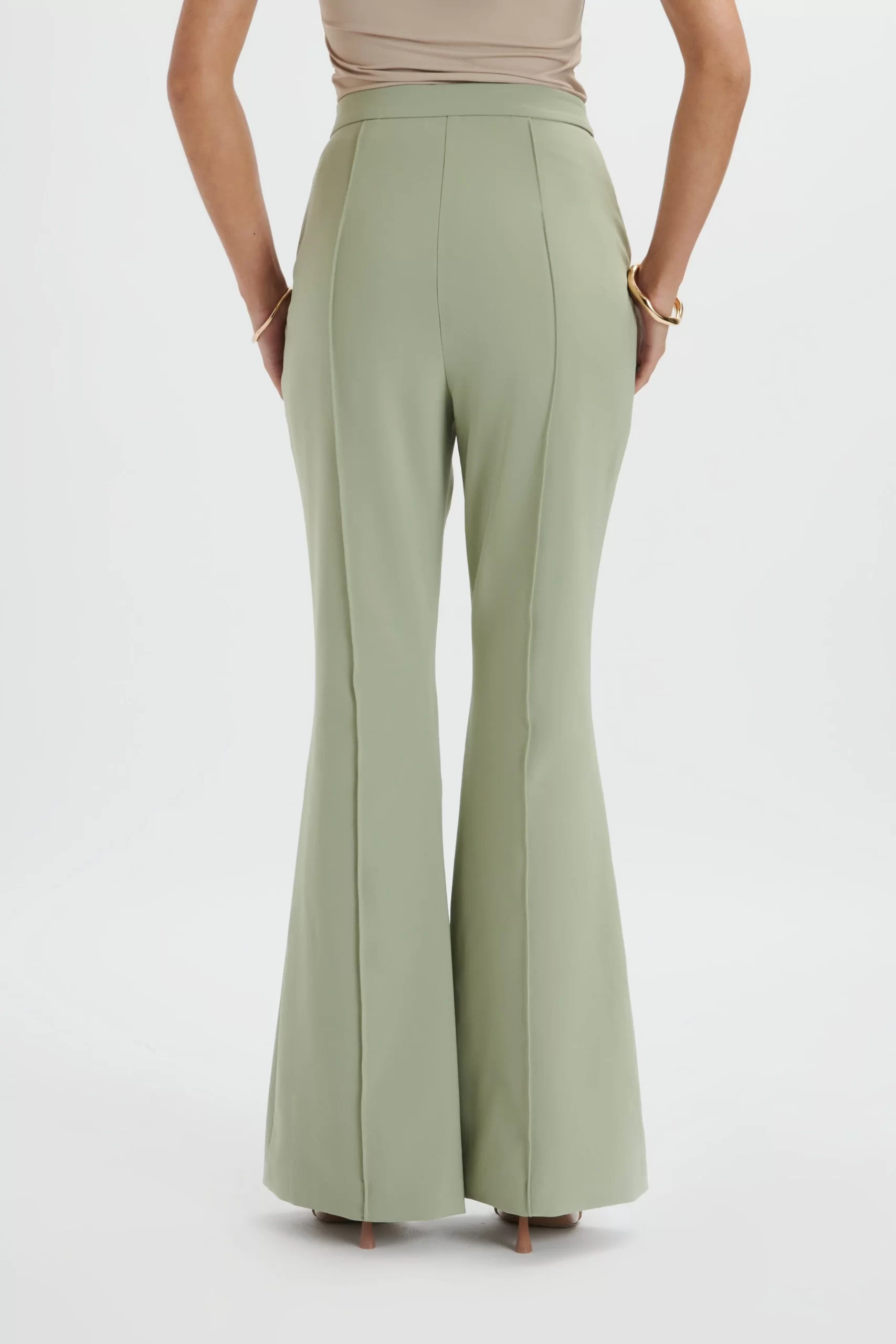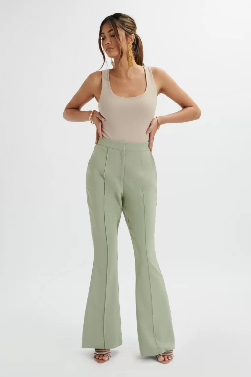 Upgrade your work wardrobe with the EMELIE trousers. Crafted from premium crepe in a sophisticated sage green shade, these tailored trousers offer a flattering fit and flare silhouette. With a pin tuck detail for elongated contouring, these trousers are both functional and stylish. Perfect for achieving a polished and professional look.