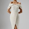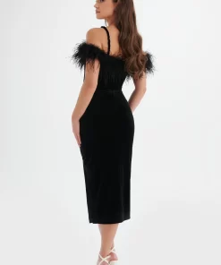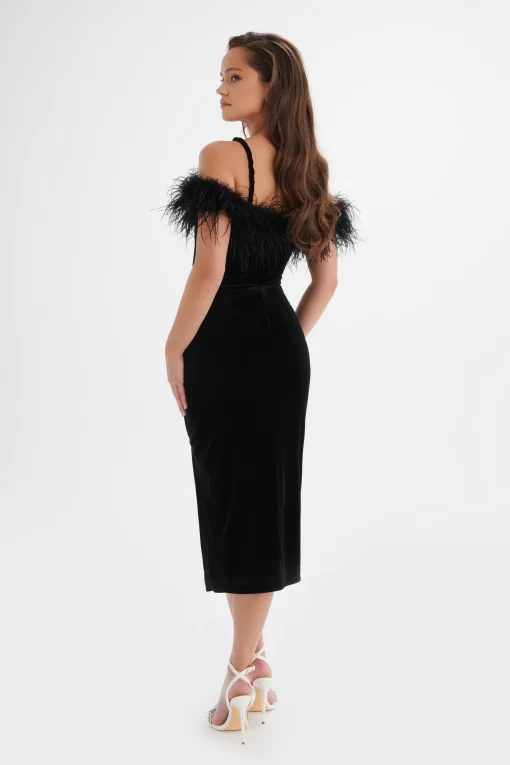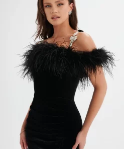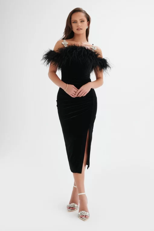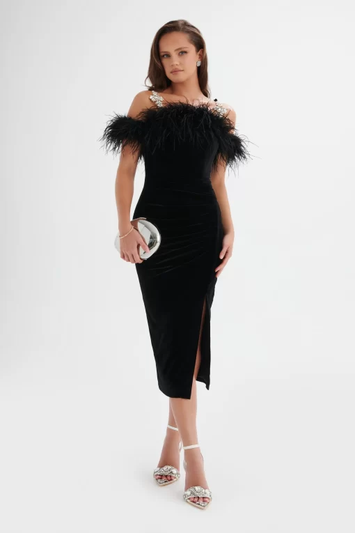 Indulge in luxury with the EVA Feather Bardot Velvet Longline Dress in Black. The longline dress features a front side split and pleat detailing at the waist, creating a beautifully accentuated silhouette. Embellished diamanté trim straps add a touch of elegance, while the opulent ostrich feather bardot neckline exudes pure glamour. Perfect for sophisticated cocktail parties and elegant soirées, this dress is designed to make a lasting impression.