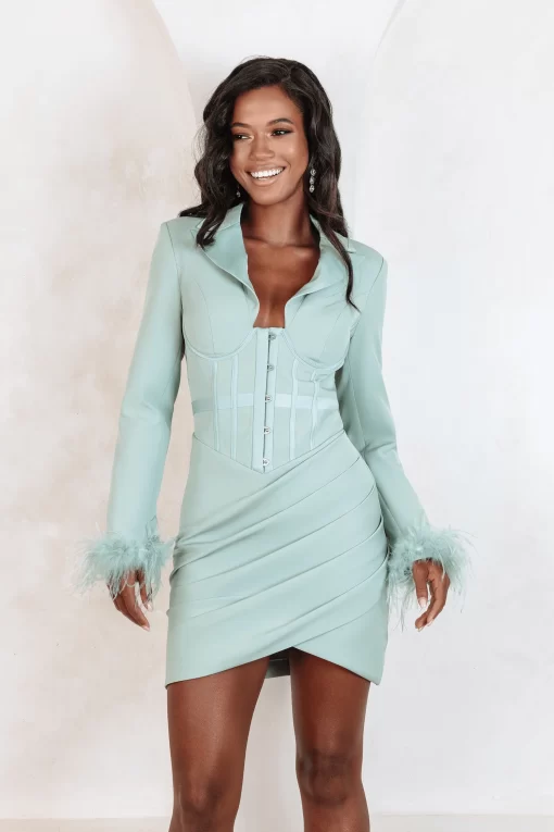 Feeling playful? Make an entrance by styling our EVELYN feather trim corset dress with a statement clutch, sky high heels and shimmering jewellery. A corseted waist cinches and accentuates your silhouette whilst pleats fall perfectly over your pins to create the ultimate blazer dress.