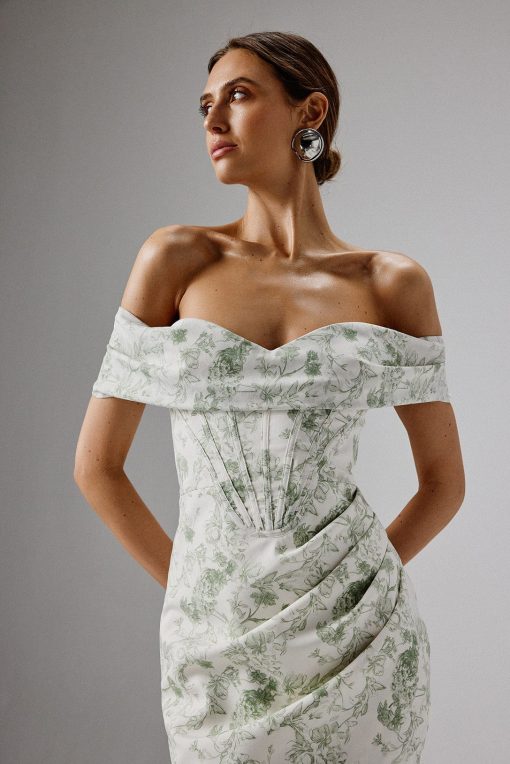 Elevate your spring wardrobe with the GEORGIE Off-Shoulder Lace-Up Mini Dress in Sage Porcelain. Crafted from luxurious crepe, this dress exudes timeless elegance with its off-the-shoulder silhouette and feminine details. The lace-up back, adorned with silver eyelets and a fixed bow, adds a chic, modern touch, while the deep pleats on the wrap-style mini skirt and corseted waist create a flattering, figure-hugging fit. Embrace the romance of spring in this must-have statement piece, perfect for parties, weddings and romantic date nights.