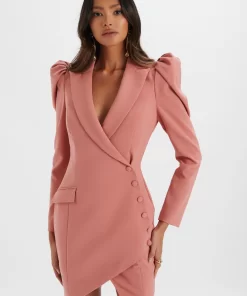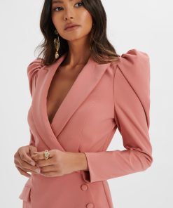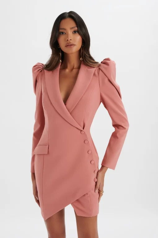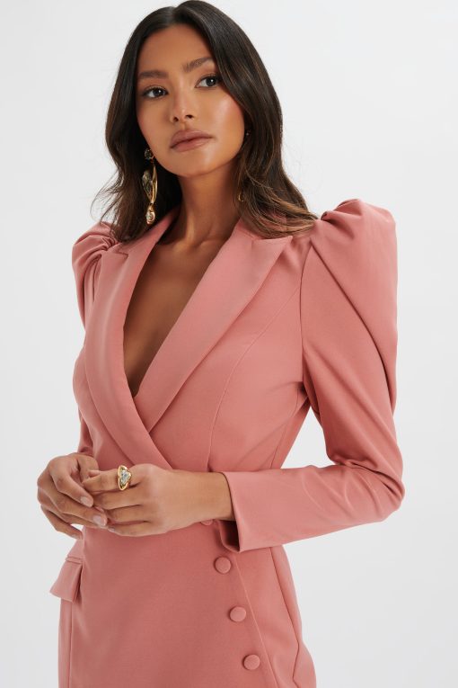 Elevate your ensemble with the GRACIE Puff Sleeve Mini Blazer Dress in Rose. Crafted from premium woven fabric in a delicate rose hue, this dress offers a modern twist on the classic blazer dress silhouette with its long puff sleeves. Featuring timeless tailoring complete with a lapel, it exudes sophistication and charm. Perfect for spring occasions such as a day at the races or weddings, this flattering dress is sure to make a statement wherever you go.