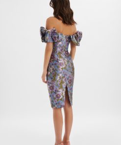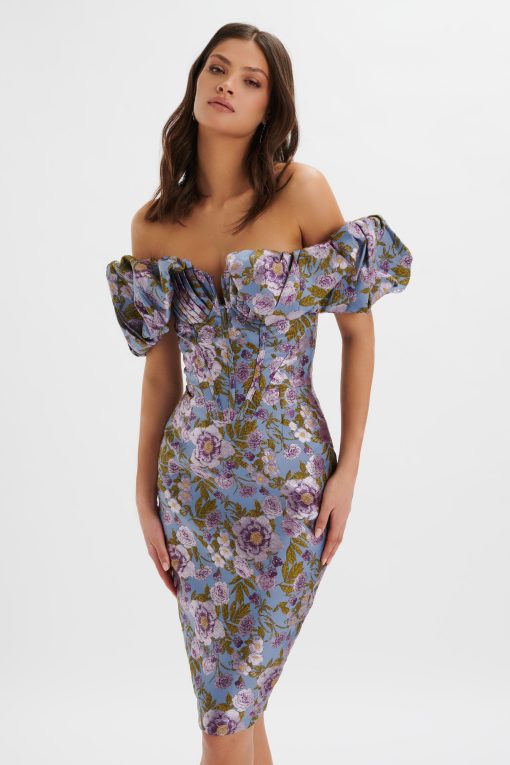 RSVP’d to that spring gala? Look no further for the perfect piece. Designed with our exclusive floral jacquard material, this midi dress features a glamorous bardot neckline with ruffle detailing throughout and corseted, bodycon fit to enhance your hourglass silhouette. Get ready to mesmerise in HARLOW.