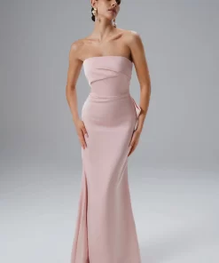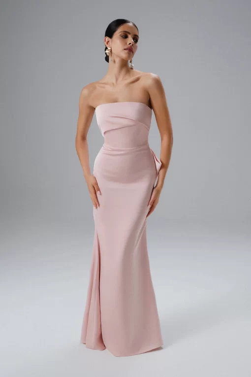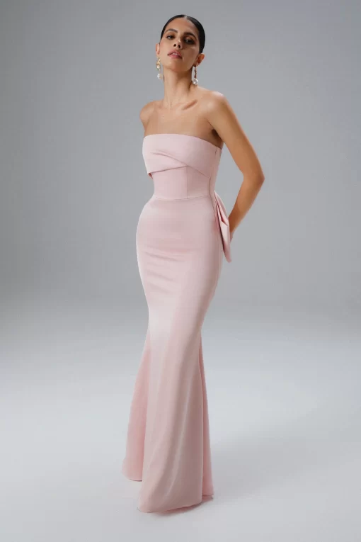 Perfect for bridesmaids and any other formal celebration, our JOVIE dress is designed for those who seek effortless grace and unforgettable style. The front features a bandeau neckline that beautifully highlights the shoulders and décolletage, while the back reveals an eye catching fixed bow, creating an alluring statement of grace and femininity. The floor-grazing maxi length elongates the form, while subtle tailoring ensures a flawless, figure-skimming fit. Style JOVIE with a tousled bun to showcase the neckline and complete your effortlessly polished look.