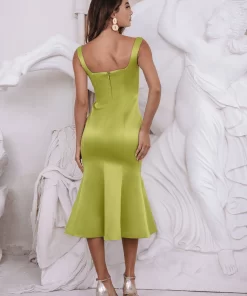 Simply unique, LAINEY is trending in pretty olive for Summer, making it perfect for special occasions like summer weddings and complimenting your tan on balmy getaways. It’s silk-satin finish pairs elegantly with a cowl neckline and the midi length reveals the perfect amount of skin