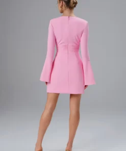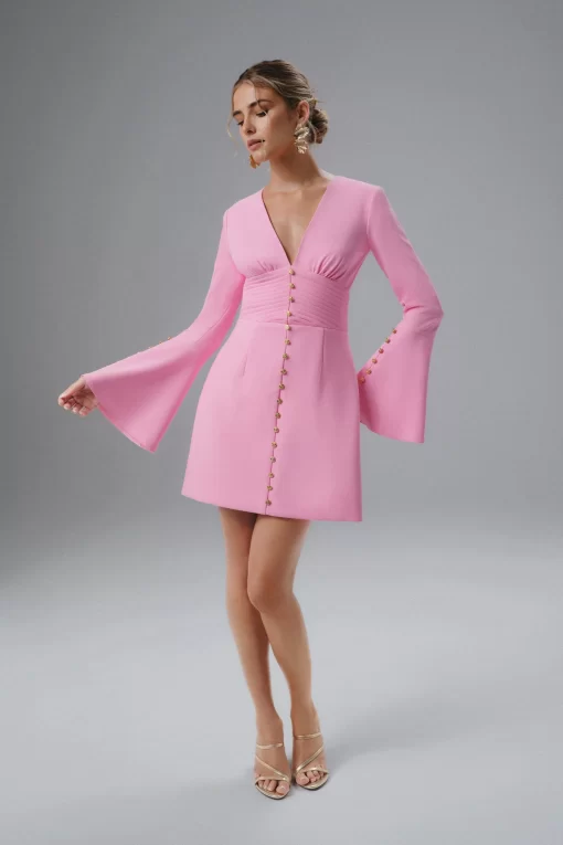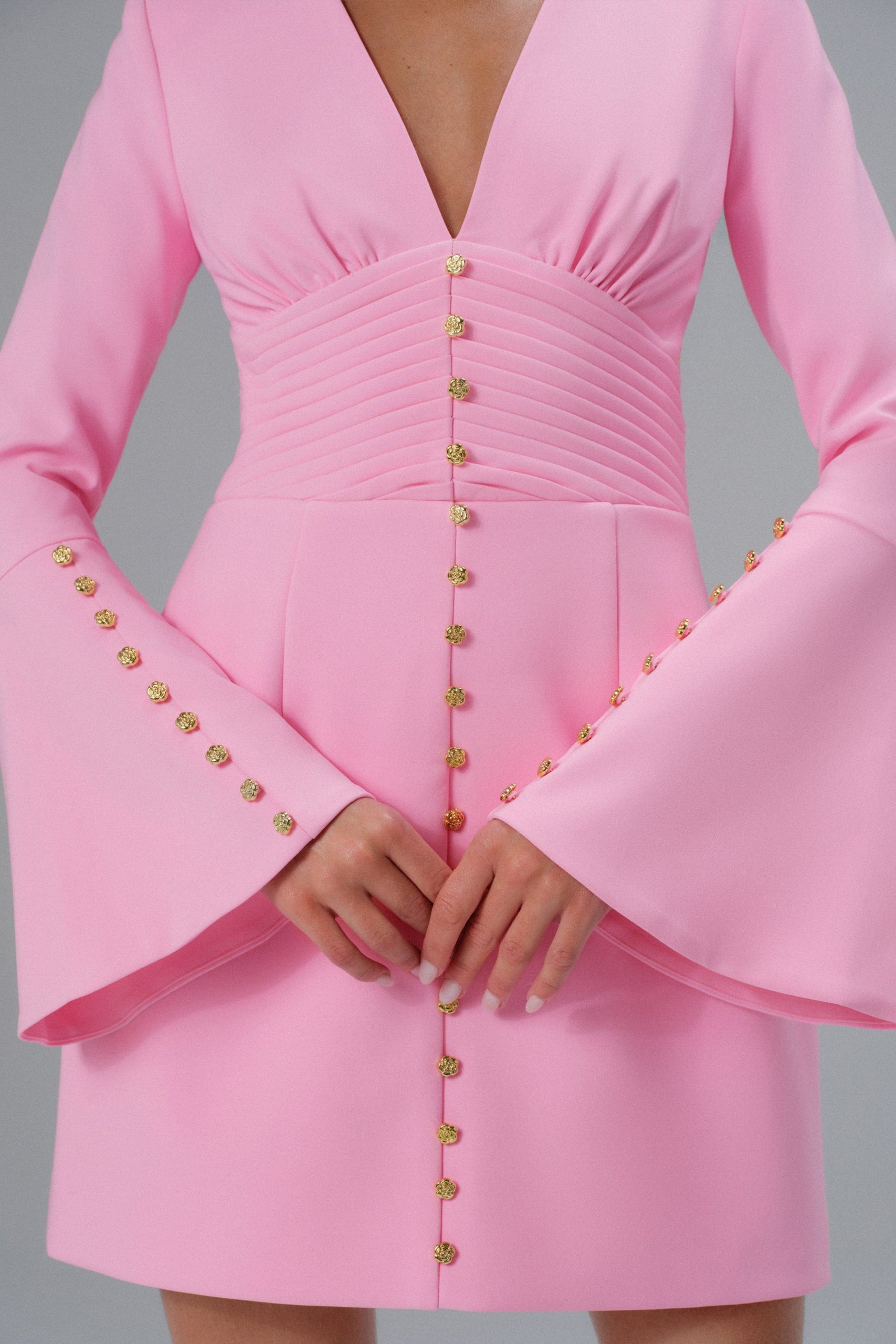 A vision of romance in vibrant pink, the LARA dress marries our signature crepe fabric with an exquisite tulip skirt silhouette and elegant long fluted sleeves. Delicate gold micro-shell buttons grace the centre front and sleeve cuffs, adding a touch of refined glamour. Designed for a flattering, close-to-body fit, the mini dress is cinched at the waist with an artful pleated waistband, creating a beautifully sculpted silhouette. This beloved best seller , reimagined in a stunning pink for summer, is perfect for balmy evenings, Ladies Day Events or wedding guest attire.