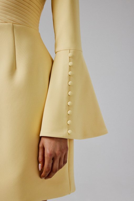 Brighten up your Spring and Summer wardrobe with LARA Fluted Sleeve Micro Shell Button Mini Dress, reimagined in a stunning seasonal yellow hue.Crafted from luxurious premium crepe,this chic mini dress features a flattering pleated waistband that defines your silhouette, flowing into an elegant tulip skirt for a timelessly feminine touch.Long flared sleeves add a refined edge, while delicate gold shell buttons along the center front and sleeve cuffs bring a touch of glamour.Perfect for spring weddings, days at the races, holiday dressing, or any formal occasion, this best-selling style is a must-have for making an effortlessly elegant statement.