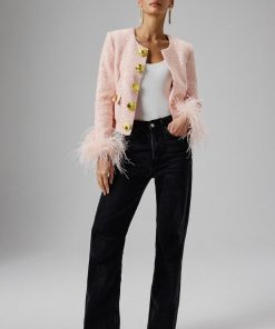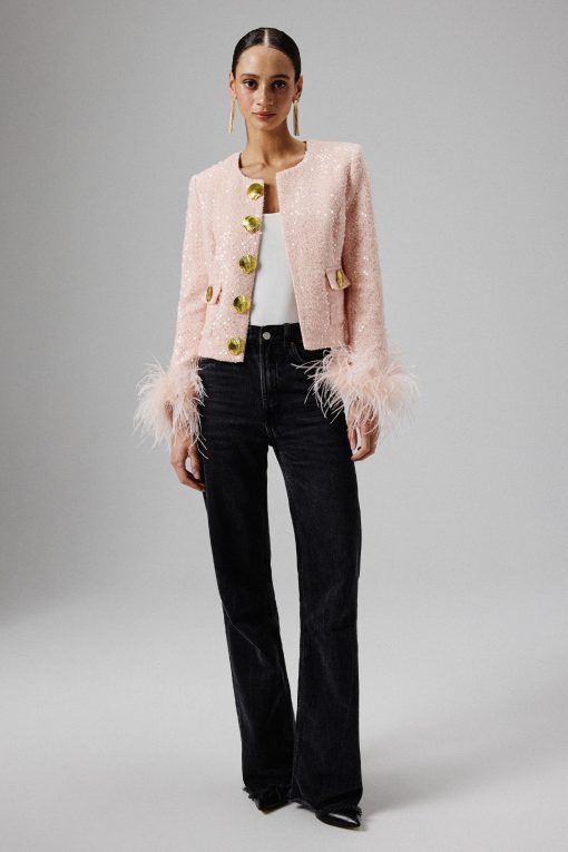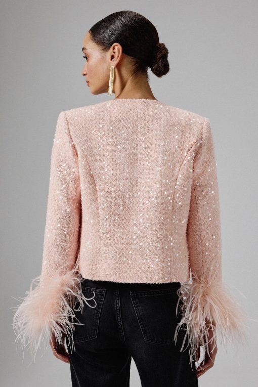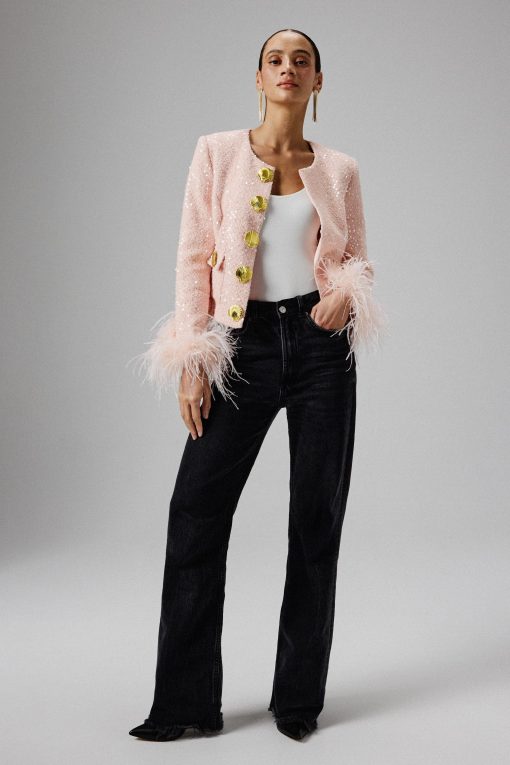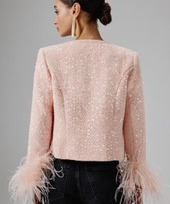 Expertly crafted from luxurious sequin boucle fabric in a stunning pink, our LARIA jacket is beautifully adorned with gold shell trim along the centre front and features patch pockets with exquisite gold shell button detailing. The long sleeves are accentuated by opulent ostrich feather cuffs, adding a touch of luxury and flair. With its collarless, cropped design, this glamorous piece effortlessly combines modern elegance with timeless charm. Step out in style and make a statement with this sophisticated pink jacket.