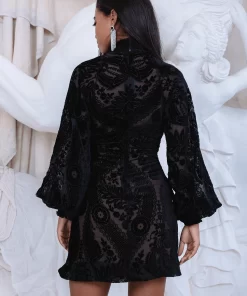 This sophisticated, velvet devore mini dress is the perfect dress for special occasions. Featuring a long balloon sleeve, high neck, and black velvety finish, this dress offers full coverage and chic style. Perfect for making a statement.