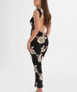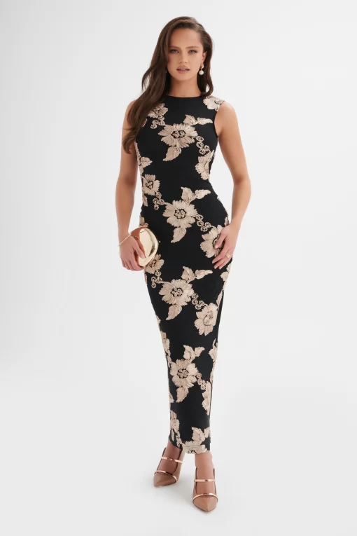 Lavish Alice Women’s Mabel Floral Satin Applique Longline Mesh Maxi Dress In Black