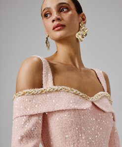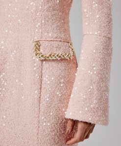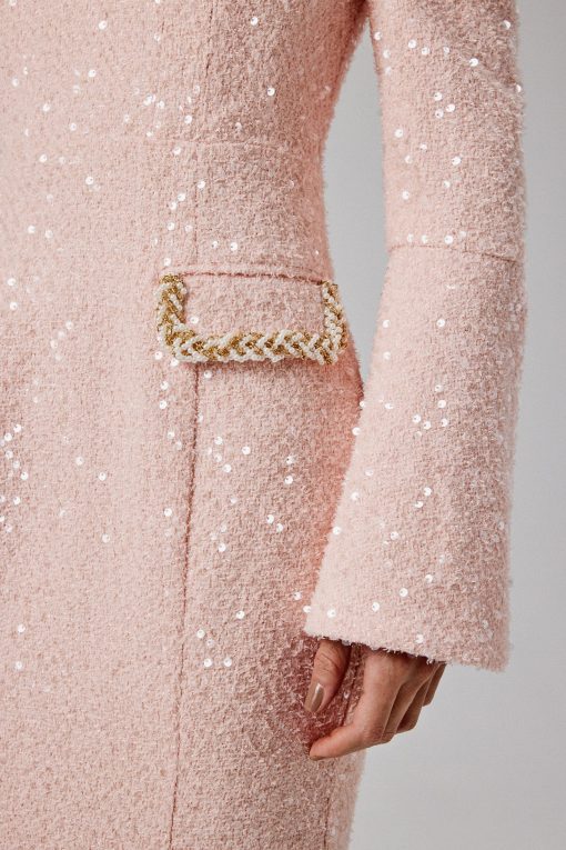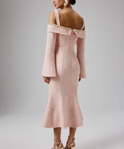 Introducing our MANDI Sequin Boucle Long Midi Dress in Pink. This dress showcases a striking sculptural silhouette that beautifully accentuates your figure, falling gracefully to a longline midi length with a fitted fishtail skirt for added drama. The pleated bardot neckline, adorned with an embellished trim, adds a touch of sophistication, while the flattering fitted sleeves and embellished fluted hem complete the look with feminine allure. Crafted from luxurious sequin boucle fabric, this sleek, sophisticated dress is the perfect choice for weddings, elegant soirées, and spring celebrations.