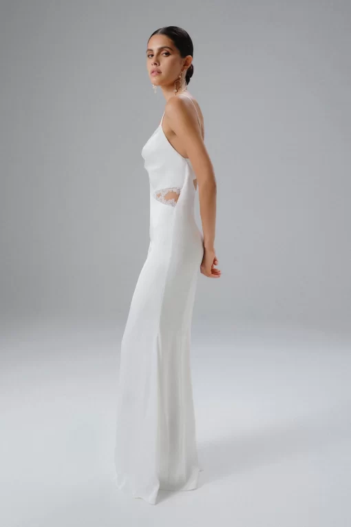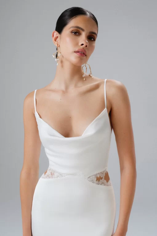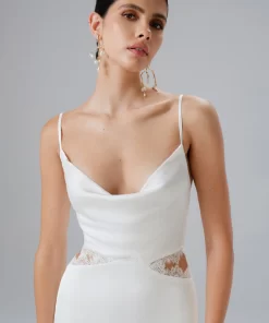 Indulge in the elegance of our MAY Lace Insert Satin Maxi Dress in White. Featuring a soft cowl neck and close-to-body fit, adorned with delicate lace trim cut outs, this satin dress embodies feminine romance and sophistication. Whether for bridal events, rehearsal dinners, or as a second dress, it radiates timeless charm and grace.