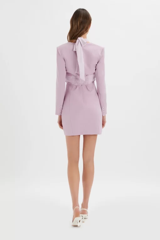 Upgrade your spring wardrobe with our MIA Satin Mix Halterneck Blazer Dress. Crafted from a premium satin mix in a stunning lilac hue, this flattering mini dress features long sleeves, pleating, and a self fabric tie strap for a perfect fit. Ideal for weddings or spring events, this dress effortlessly combines style and sophistication.