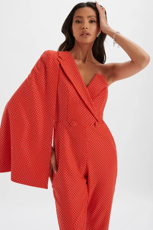 Lavish Alice Women’s Mischa Crystal Embellished One Shoulder Cape Jumpsuit In Red