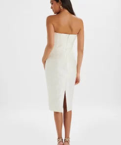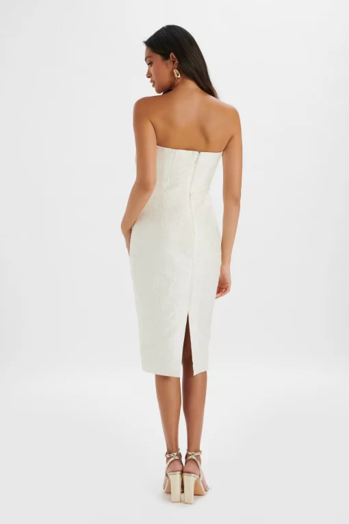 Get ready to turn heads in our MONTANA 3D Flower Bandeau Midi Dress. Perfect for a hen-do or other bridal affairs, this stunning midi dress features an elegant bandeau neckline and a statement large rosette. Crafted from premium white jacquard with a flattering close-to-body fit, this midi dress is perfect for adding a touch of femininity to any special occasion.