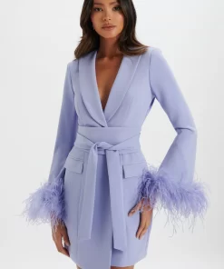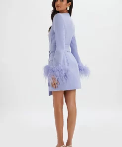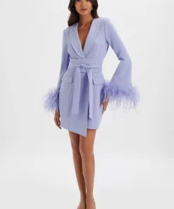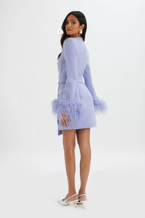 Crafted from high quality crepe in cornflower blue, the NIKOLA classic blazer dress features a close to body fit, front jet pockets with flap, and double breasted self fabric buttons. The delicate ostrich feather flared cuff adds a touch of elegance, while shoulder pads and princess seams provide a premium silhouette. Secure coverage is ensured with the fixed front body wrap over, and central back zip with hook and eye fastening. Includes an optional obi belt to cinch the waist for a flattering look. Fully lined, faced, and bagged out for ultimate comfort and style.