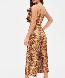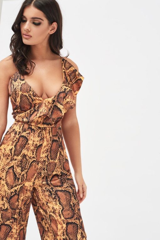 Featuring a one shoulder frill, this wrap design culotte shapes the body beautifully while the culotte leg contrasts the fitted waist. In a luxe satin snake print, NORA is perfect for golden hour and way into dark nights.