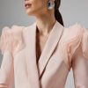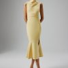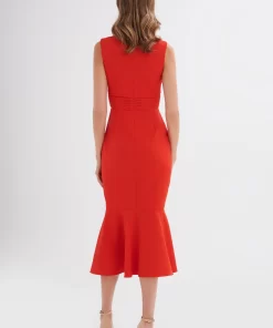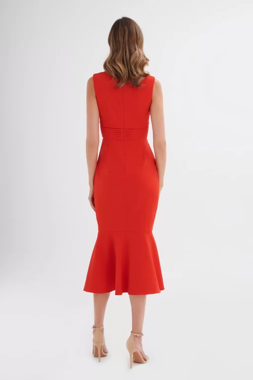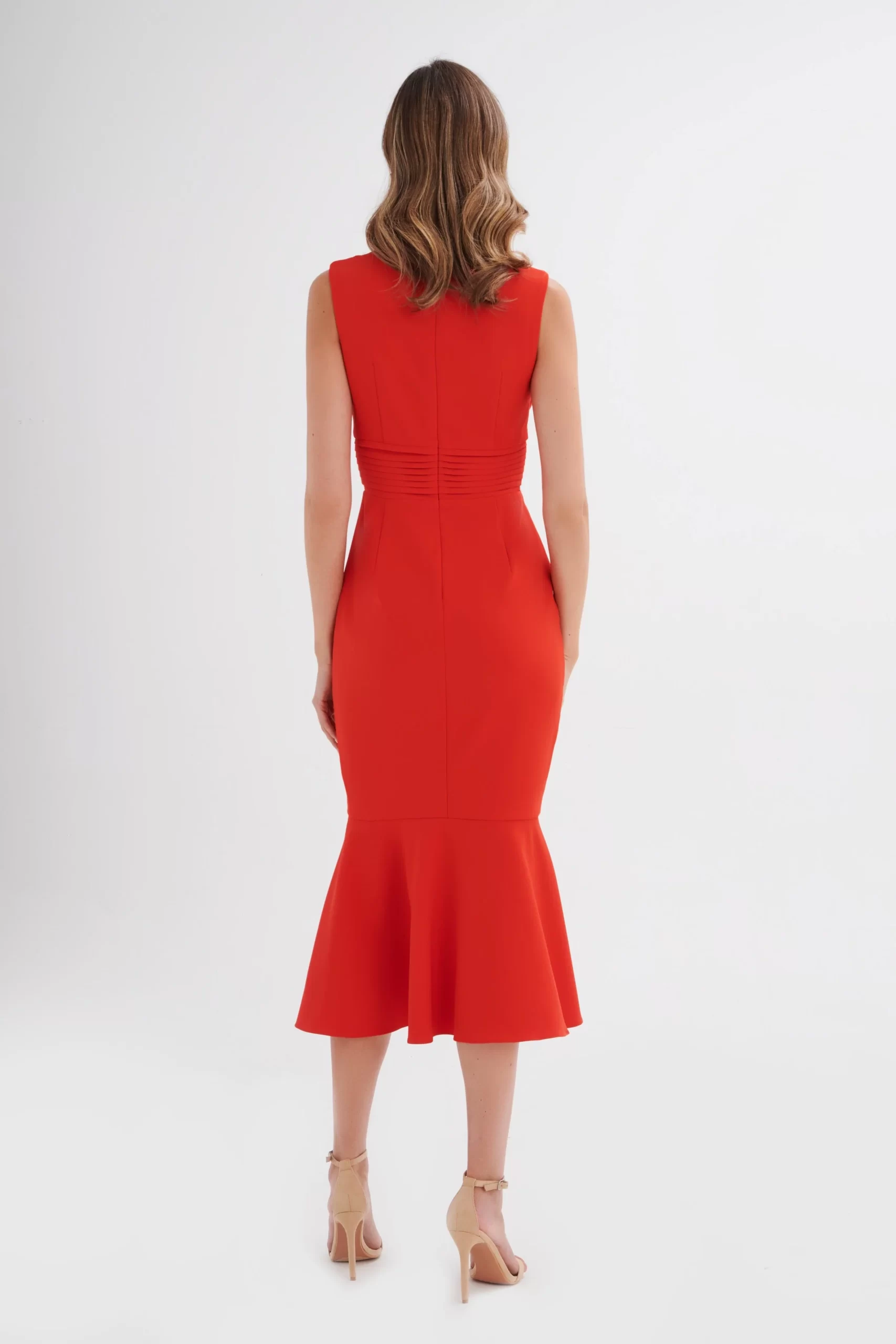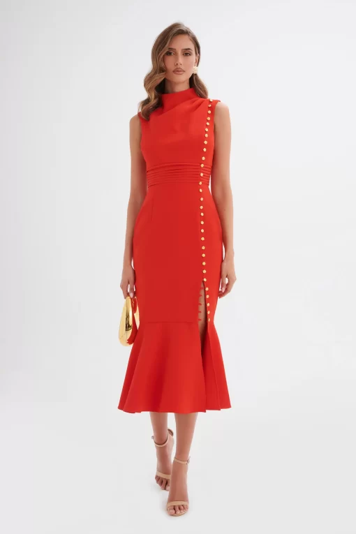 Step into sophistication with our SAFFRON High Neck Rose Button Midi Dress in red. Crafted from premium crepe in a striking red hue, this elegant ensemble boasts a chic high neck adorned with delicate pleat detailing. Adding a touch of glamour, gold rose-shaped buttons cascade down the front, accentuating the sleek fitted silhouette. Complete with a long midi skirt featuring a thigh split and flounced hem, this dress exudes timeless elegance and refined sophistication, perfect for weddings, races, or cocktail parties.