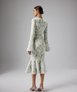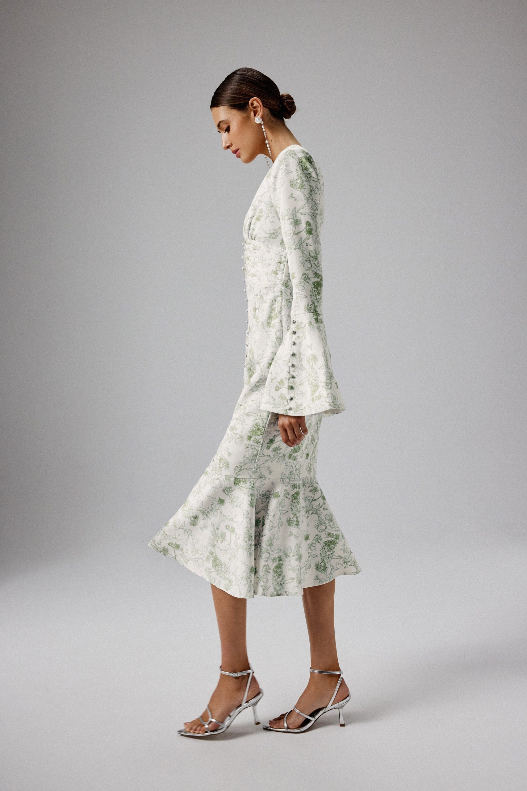 Lavish Alice Women’s Salma Fluted Sleeve Longline Fishtail Midi Dress In Sage Porcelain Print
