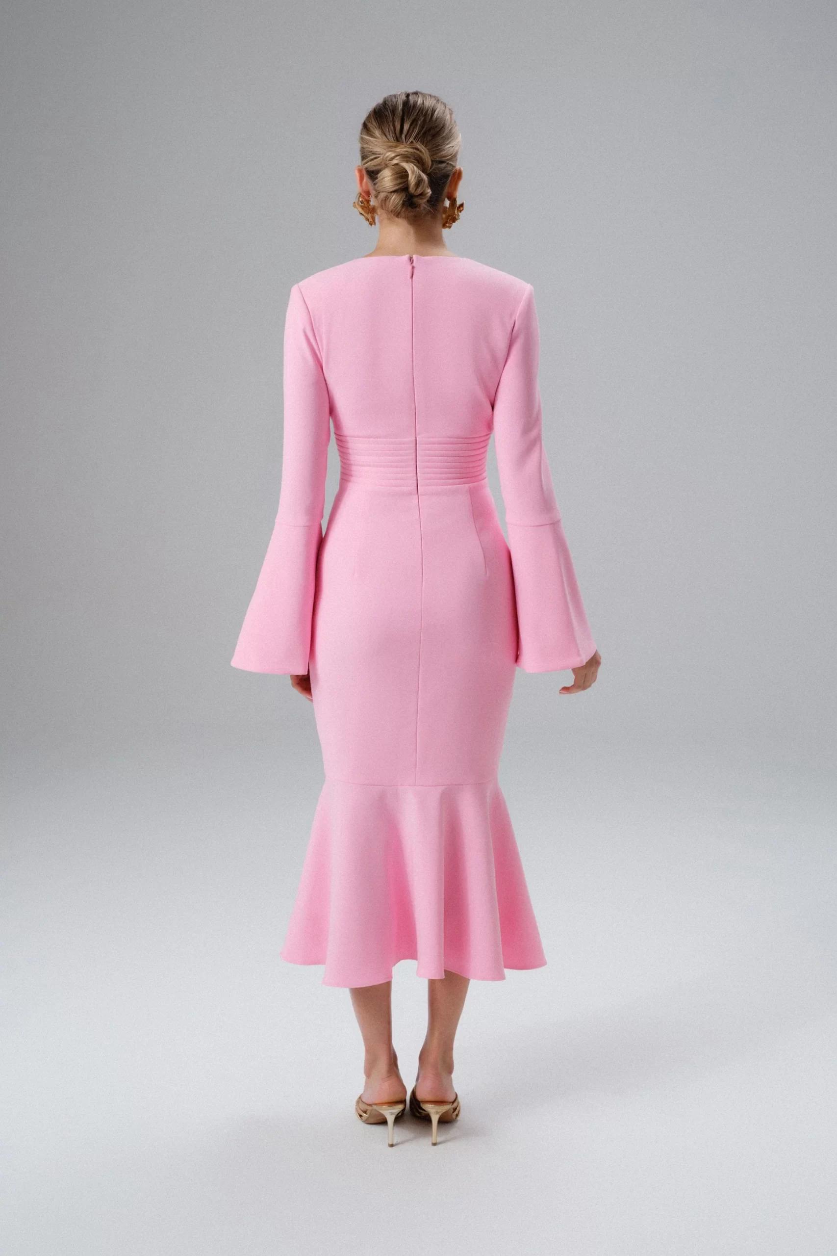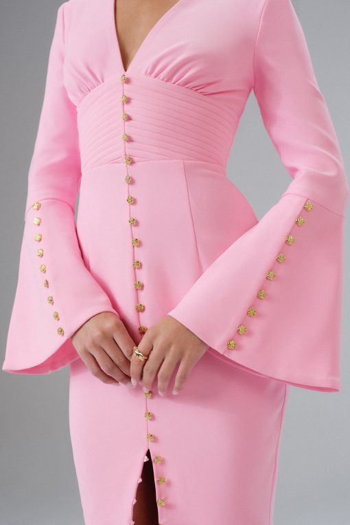A crowd favourite, the SALMA Midi Dress , is reimagined in a vibrant pink for the perfect summer statement. Crafted from luxurious crepe, it features a close-to-body fit that sculpts your silhouette, flowing seamlessly into a flared fishtail hemline for an elegant, feminine finish. The pleated waistband cinches the waist beautifully, while gold micro rose buttons cascade down the centre front and embellish the fluted sleeves for a touch of glamour. Perfect for race season, summer events, and special occasions, SALMA is a standout piece that guarantees effortless sophistication.