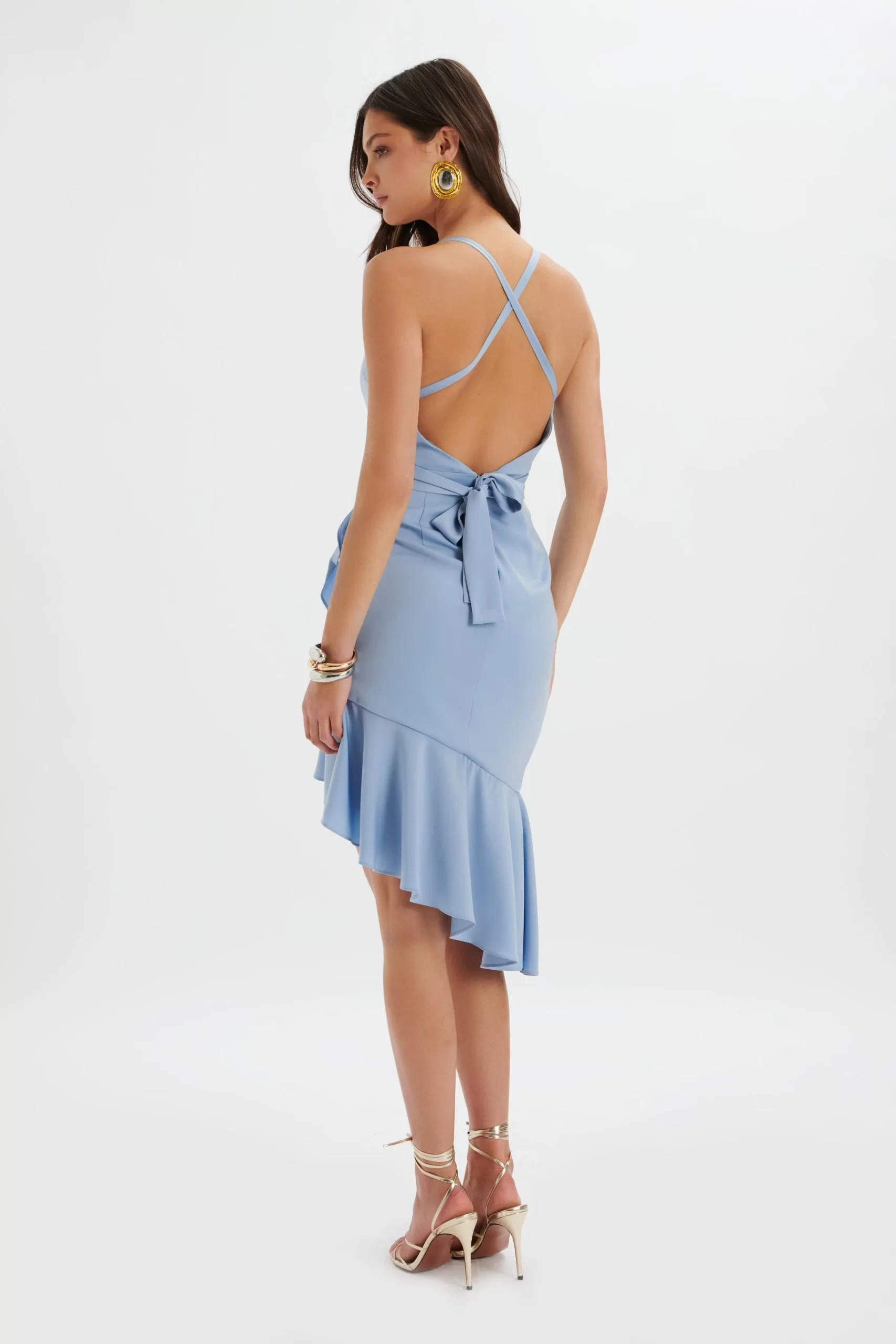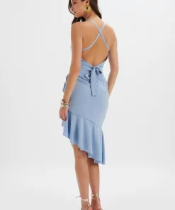 Soft and romantic, our SAWYER Cross Back Cowl Neck Midi Dress In Cornflower Blue gently skims your silhouette and flatters with a draped neckline. Ruffles fall delicately at the hemline creating a delicate yet glamorous look. RSVP’d to spring garden parties and weddings? This is the dress you need to make an entrance no matter the occasion.