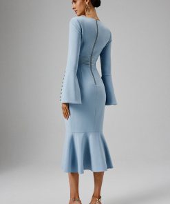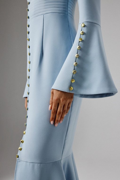 The SERENA Fluted Sleeve Micro Shell Button Midi Dress is the epitome of timeless elegance. Crafted from luxurious light blue crepe, this design combines sophistication with striking detail. A square neckline adorned with an embellished trim, a flattering pleated waistband, and a fit-and-flare fishtail hemline create a sleek, feminine silhouette. Gold shell buttons along the center front and fluted cuffs add a touch of refinement, while concealed shoulder pads ensure a premium, tailored fit. Perfect for weddings, formal occasions, or ladies’ days, the SERENA brings a polished pop of colour to your most special moments.