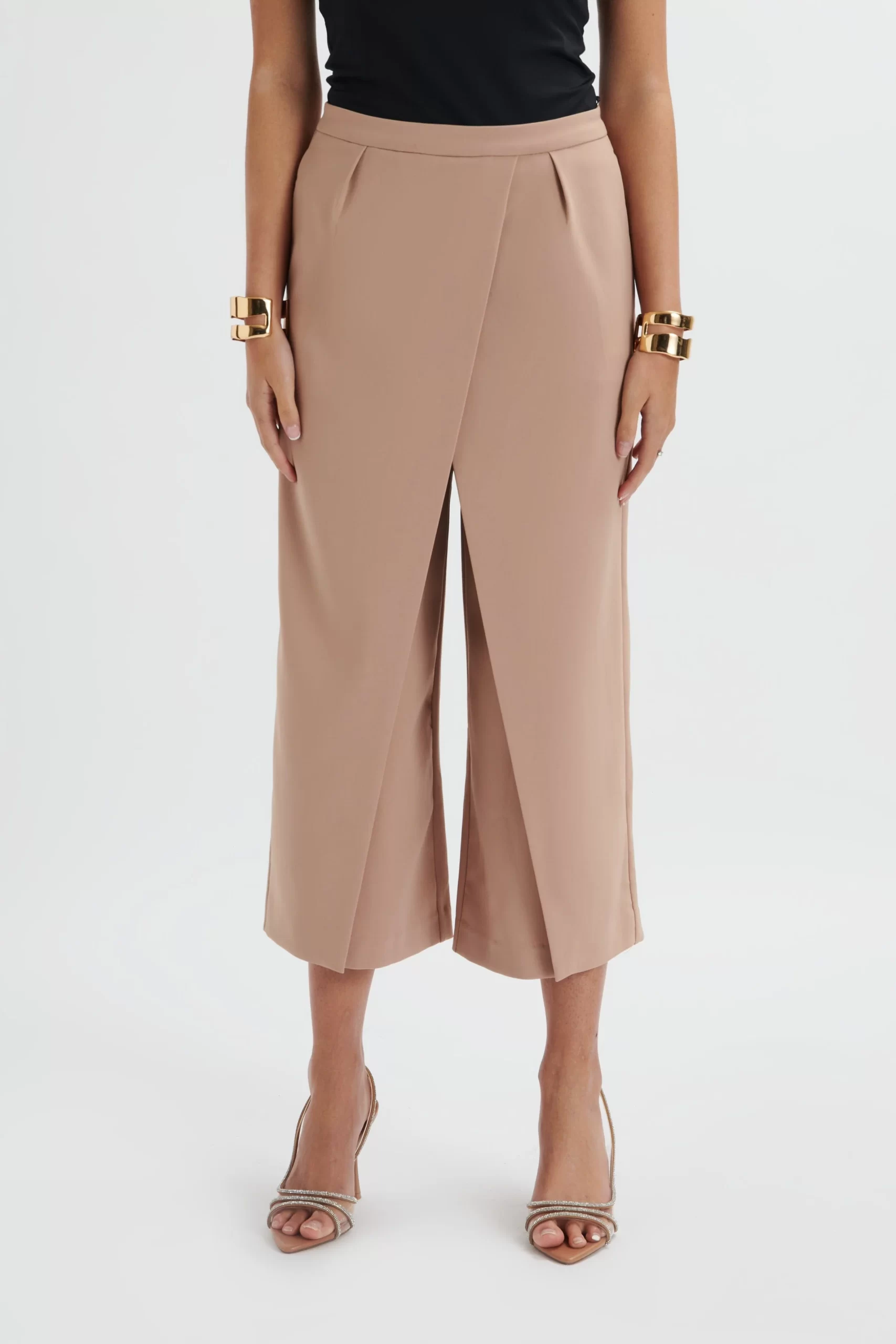 Experience timeless tailoring with our SIYA trousers. Crafted from high quality camel crepe, featuring a classic culotte style, wrap over palazzo design, and waist darts for shaping. With a mid-rise and cropped length, these trousers offer a functional finish with pockets, concealed central back zip, and full lining.