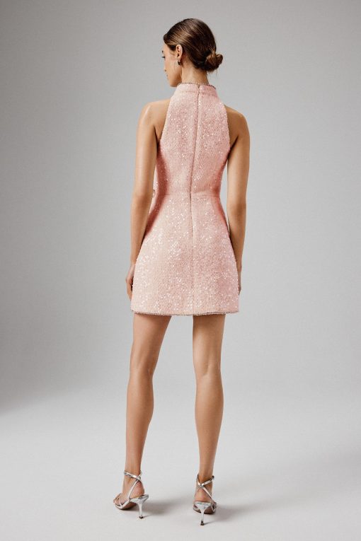 Radiate elegance and charm in the SOLENE Sequin Boucle High Collar Mini Dress, a luxurious piece crafted from light-catching pink sequin bouclé that dazzles with every step. Designed with a sophisticated high neck and a chic front keyhole cutout, this dress exudes elegance, while an embellished bow accent at the neckline and a crystal embellished bow at the side split add extra sparkle. Finished with delicate, shimmering trim along the high neck and split and a romantic tulip skirt silhouette, this mini dress embodies feminine grace and refined style. Perfect for date nights, parties, or special occasions, the SOLENE dress will make you feel effortlessly elegant and radiant.