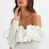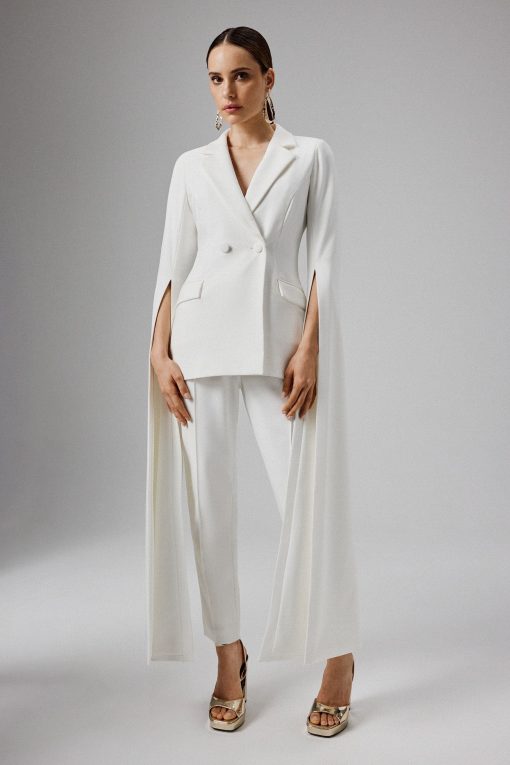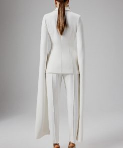 Introducing our Cape Sleeve Blazer, exquisitely crafted from premium crepe in a timeless and sleek white hue. This elegant blazer showcases a classic lapel design, complemented by functional self-fabric buttons and a stylish jet pocket with a flap. The dramatic long cape sleeves add a striking flair, transforming this blazer into the perfect statement piece for any formal occasion. Elevate your ensemble and make a chic, stylish impression with this modern and sophisticated blazer.